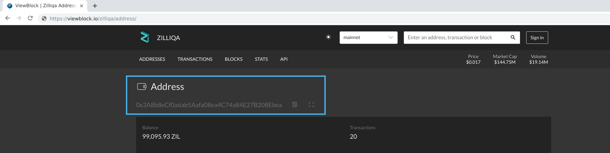For example, if we want to find the checksum version of Coinhako's hot wallet address, 0x3a8b8ecf0a6ab5aafa08ea4c74a84e27b208ebea, we can open its ViewBlock page, https://viewblock.io/zilliqa/address/0x3a8b8ecf0a6ab5aafa08ea4c74a84e27b208ebea, and copy the checksum version from there, outlined in blue below.