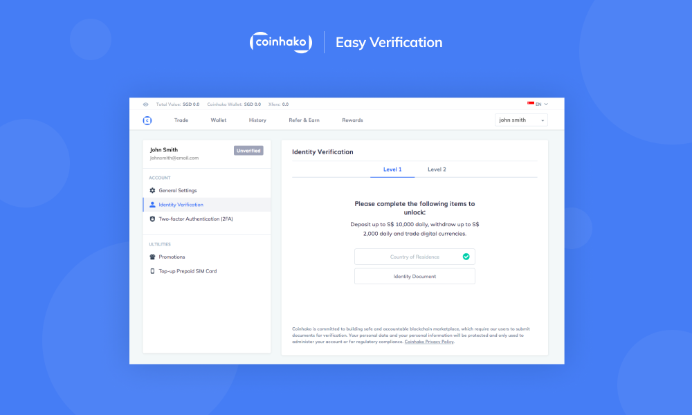 Coinhako user accounts are awarded different account levels for the successful submission of personal documents. With every level that you have completed, you unlock an added benefit and get to enjoy enhanced services.