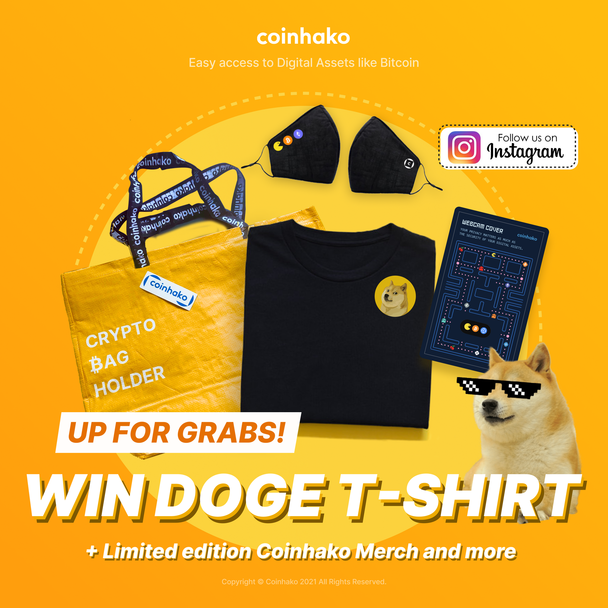 Stand a chance to win a DOGE t-shirt and get your hands on limited Coinhako merchandise like our crypto bag holders, masks, stickers and more!