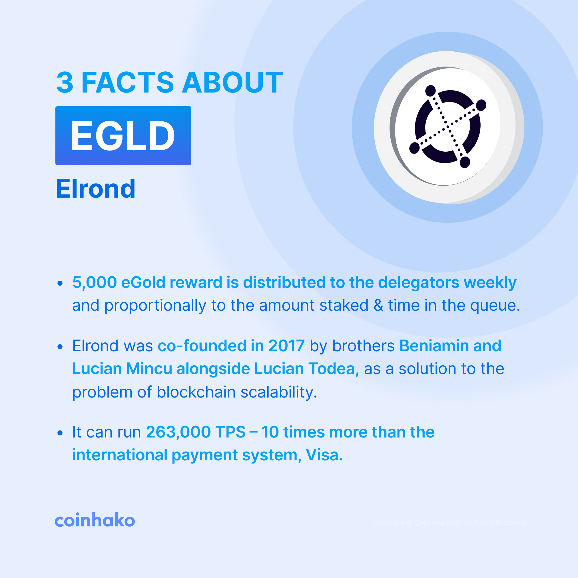 EGLD, also known as eGold, is the native token of the Elrond blockchain that is used for paying network fees, staking, smart contract execution and rewarding validators. The maximum supply of the token can never exceed 31,415,926 EGLD.