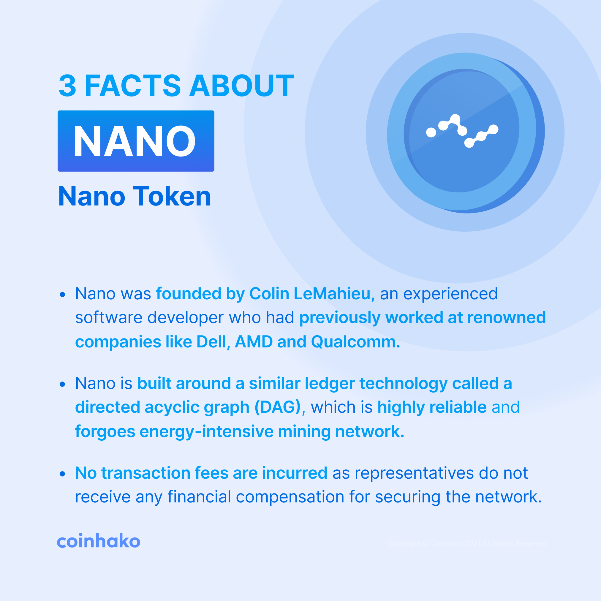 Founderd by Colin LeMahieu, the development of the Nano project began in 2014 under the name RaiBlocks. It was rebranded to Nano (NANO) in January 2018, with the name chosen to better represent the speed and simplicity the project offers to users.