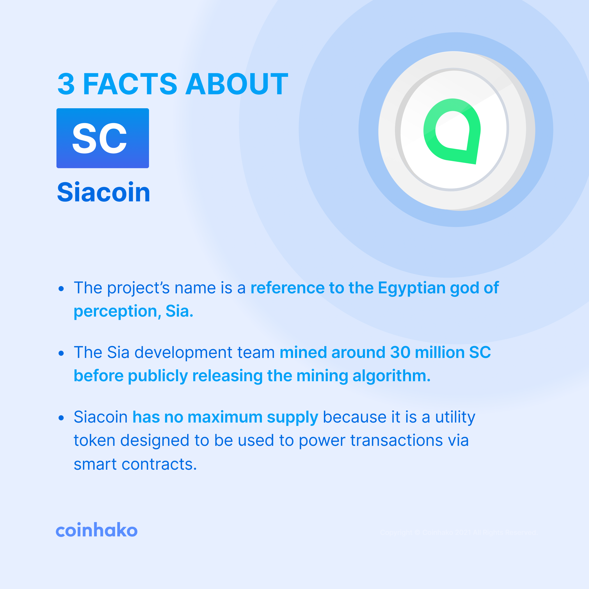 Siacoin (SC) is the native utility token of the Sia platform. Siacoin acts as the method of payment on the network, with renters paying hosts with SC to use the hard drive space and hosts are paid in SC once file is stored.