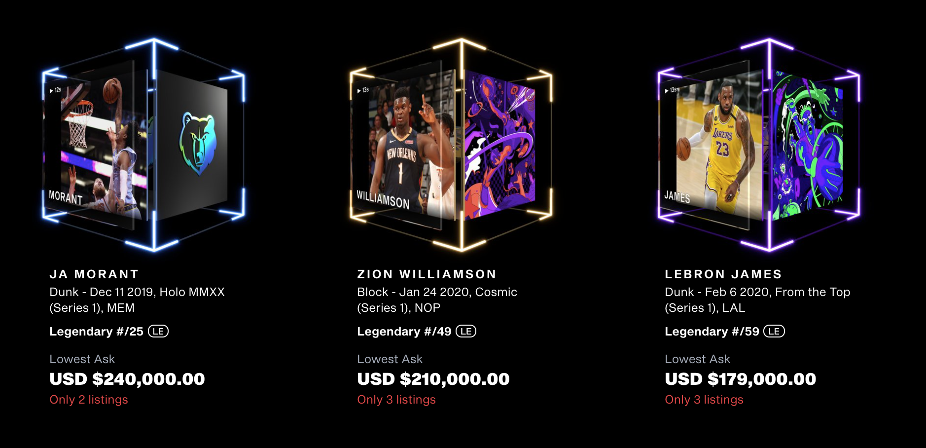 In the sports world, NBA recently launched NBA TopShot, which is a collectibles marketplace for NBA fans. An NFT of a video clip of LeBron James dunking was sold for more than $200,000 USD on the NBA Top Shot marketplace. However, the most valuable listing currently is of NBA player Ja Morant at $240,000 USD.